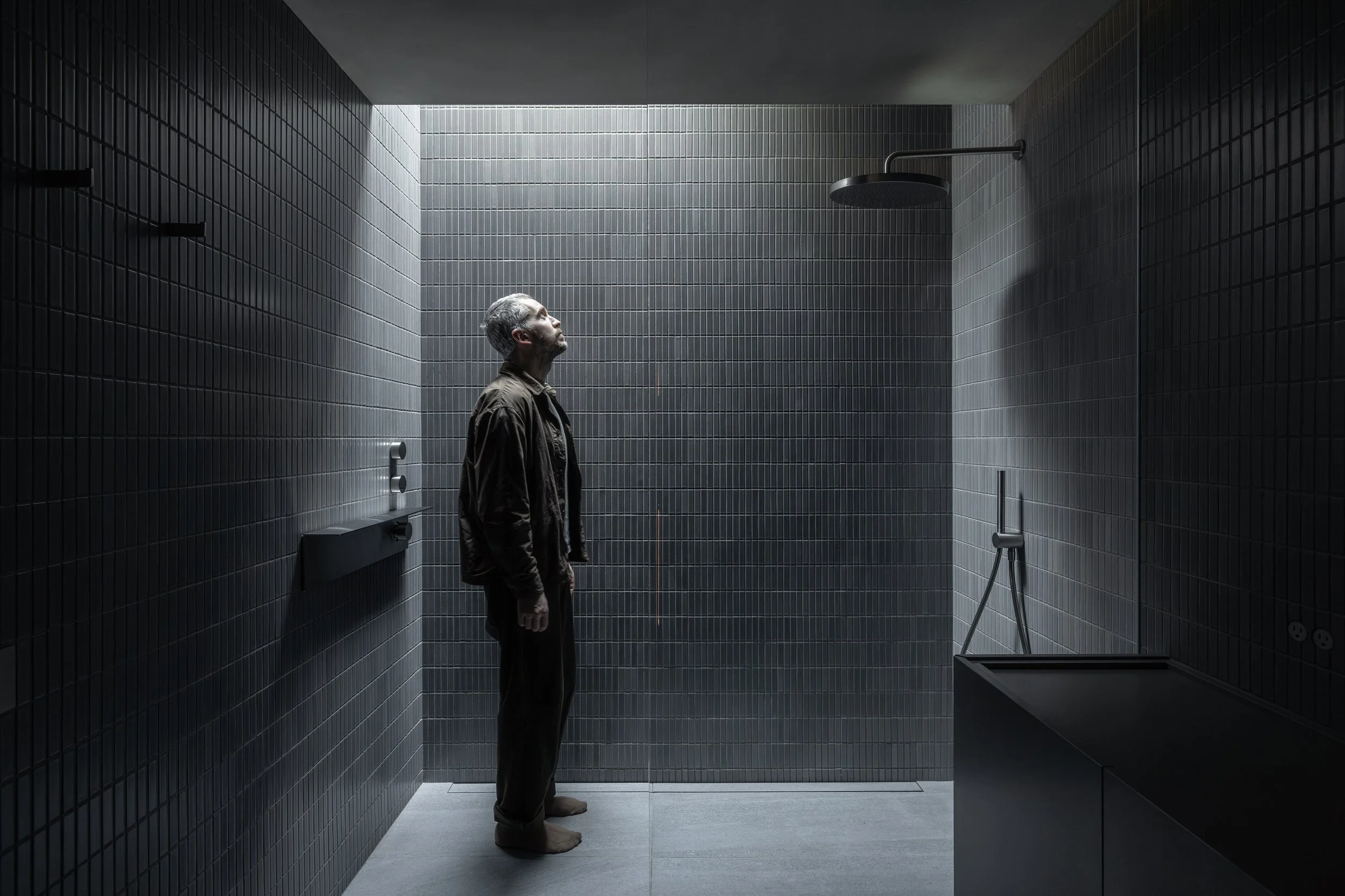 The stairway up to the “sleeping floor” is calming in its simplicity. Once upstairs, beams of light peeking through the upper volume of the light well cast mesmerizing slatted shadows. The tone shifts noticeably further into a calm quiet living space. The light is sparser and moodier. The primary bedroom and ensuite are rich and dark in their material palette, while still retaining the restrained simplicity of the rest of the home. A vase, a stack of books or antiquity here and there, but otherwise a precise and pared down modernism bleeds into the beautiful naturalism of the darker plaster walls. The bathroom continues this motif, contrasted slightly by the nearly-invisible pane of glass and recessed shower head in the bathing area. A modest dressing room, though precise in its execution, feels quiet, and perfectly at home with the humble approach to the space.
