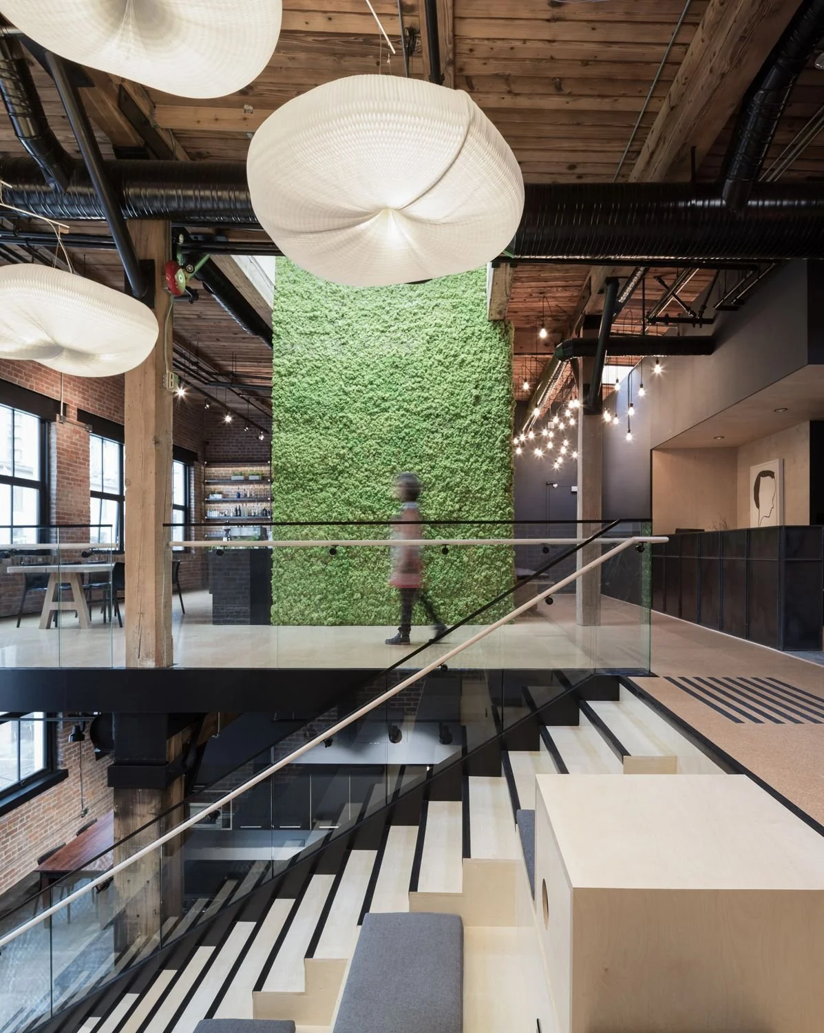The second level of the Slack offices opens through an atrium seating area and stairwell that connects the main level with a small lounge overlooking Hamilton Street. Balancing the industrial atmosphere of a tech-company headquarters, the offices retain warmth with an eclectic mix of locally sourced furniture and artwork, and abstracted natural elements. The concept of an ‘interior nature’ is explored with the mossy wall, located at the heart of the headquarters. Overhanging this space is sculptural pendant lighting by local creative firm, Molo Design. The organic shapes, suspended in the high space between upper and lower levels like floating clouds or tree mushrooms, connect working and social space.